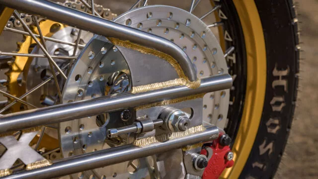 One of the most impressive elements is the rear section. The seat rails and swingarm were built from chromoly tubing and joined using traditional bronze brazing, an old-school technique that adds both strength and visual character. The swingarm design pays homage to Arlen Ness, featuring a twin-tube layout reinforced with an X-shaped brace.