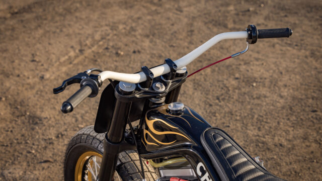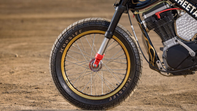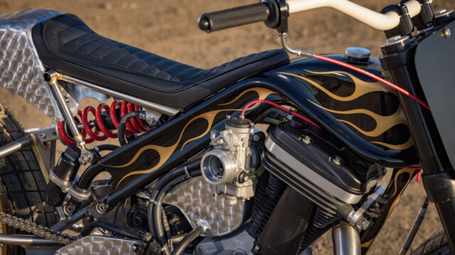 Once the fabrication was complete, the frame and tank were painted by Cheetah’s longtime friend, S Paint, before Cheetah added hand-painted flames himself. The result is a dramatic black finish accented by classic flame detailing, blending old-school style with modern flat track form.