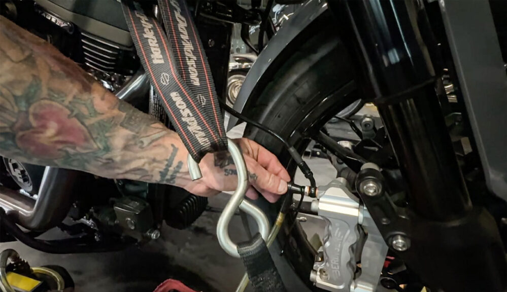 DOT 4 went into use when H-D introduced antilock brakes. This fluid is highly corrosive and will eat paint and powdercoat rather quickly, so if you have a spill it needs to be cleaned up immediately. It is in your best interest to cover any painted or powdercoated parts so that if you do have a spill you won’t have your finishes at risk. If you are doing this yourself use good quality brake fluid. At the shop we used the appropriate Motul product.