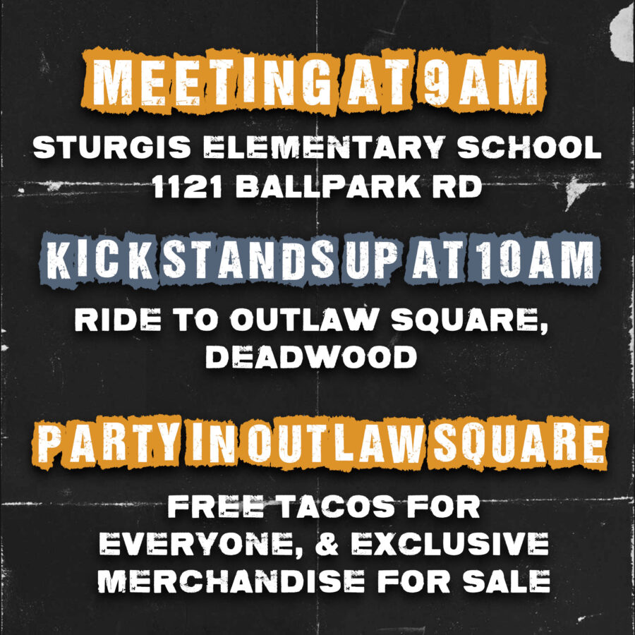 Riders will meet at Sturgis Elementary School (1121 Ballpark Rd, Sturgis, SD 57785) starting at 9:00am MDT, with kickstands up at 10:00am sharp for a police-escorted ride through the Black Hills, which will take the scenic route all the way to Outlaw Square in Deadwood.